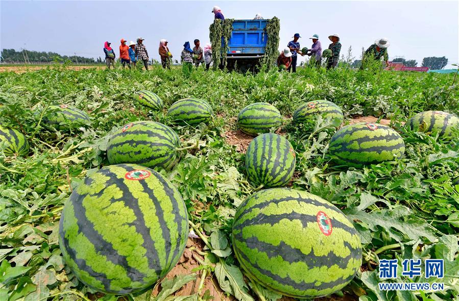 7月2日,河北省滦南县青坨营镇的瓜农在田间收获西瓜。新华社记者杨世尧摄