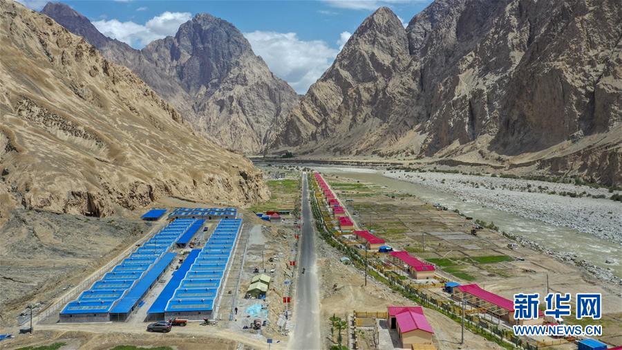 这是在新疆塔什库尔干塔吉克自治县大同乡拍摄的阿克托尕栏杆村西拉夫迭易地扶贫搬迁安置点,标准化棚圈(左侧蓝色屋顶)等基础设施完备(6月18日无人机拍摄)。