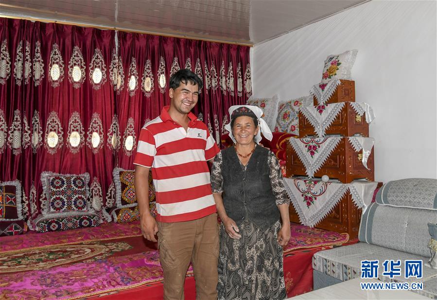 这是在新疆塔什库尔干塔吉克自治县大同乡的一处易地扶贫搬迁安置点安居房内拍摄的古力西尔汗·阿迪那买买提与母亲的合影(6月18日摄)。他家已于2018年脱贫。