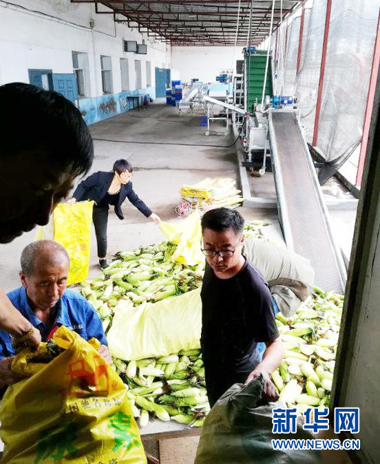 于文涛(右一)到一家食品生产企业帮助贫困户销售粘玉米(资料照片)。 新华社发