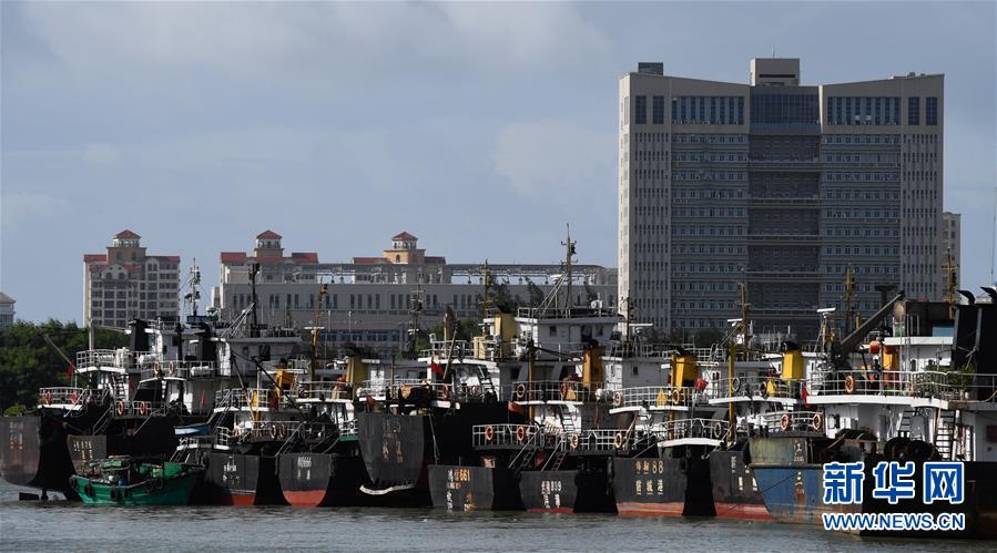7月2日,船舶在海口新港码头内停靠避风。 当日,中央气象台发布台风蓝色预警,海口附近海域的大部分船舶已到就近港口避风,确保安全。 新华社记者 杨冠宇 摄