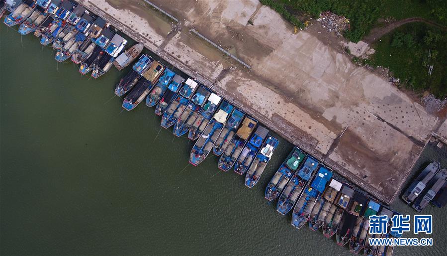 7月2日,渔船在海口新港码头内停靠避风(无人机拍摄)。 当日,中央气象台发布台风蓝色预警,海口附近海域的大部分船舶已到就近港口避风,确保安全。 新华社记者 杨冠宇 摄