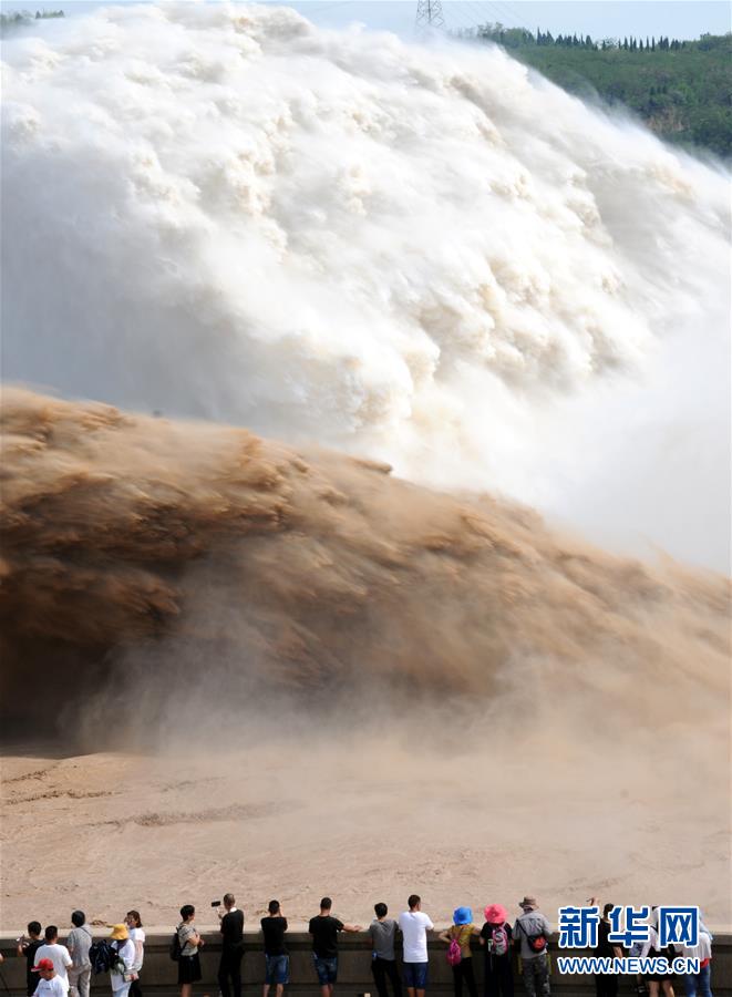 7月2日,游客在小浪底库区观看“双龙”飞腾景观。 当日,从黄河小浪底水库下泄的清澈水流与裹挟泥沙的混浊水流分别从明流洞、排沙洞奔腾而出,好似白黄两条“巨龙”。 新华社发(苗秋闹 摄)