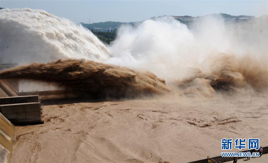 7月2日,游客在小浪底库区观看“双龙”飞腾景观。 当日,从黄河小浪底水库下泄的清澈水流与裹挟泥沙的混浊水流分别从明流洞、排沙洞奔腾而出,好似白黄两条“巨龙”。 新华社发(苗秋闹 摄)