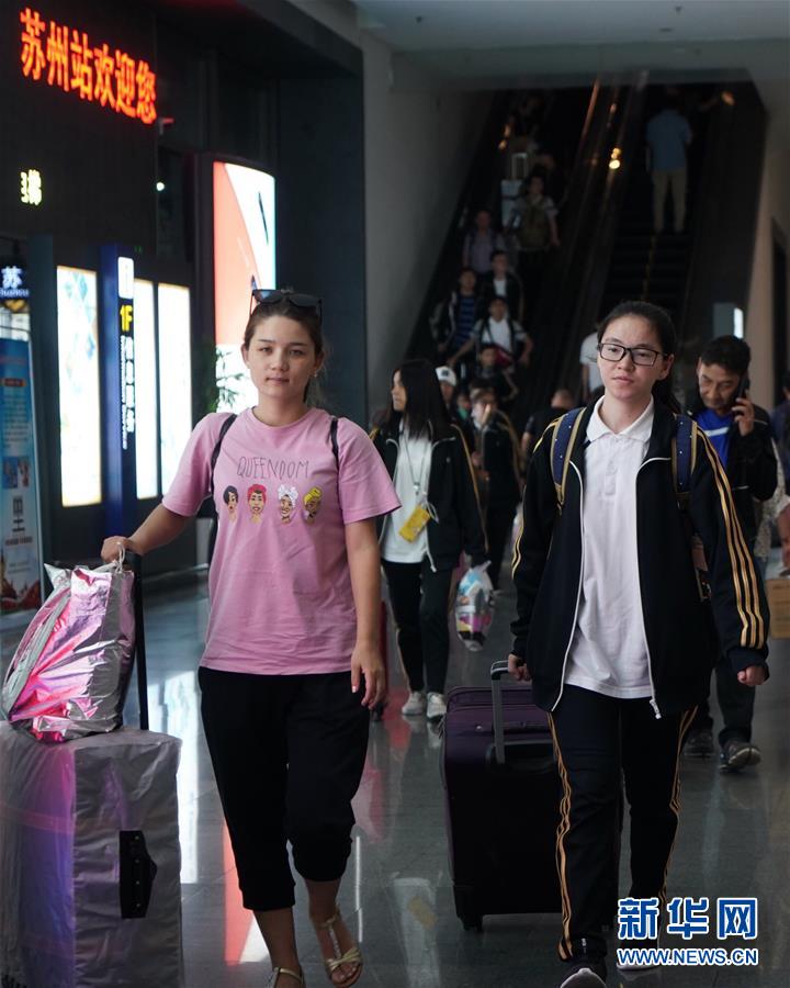 7月2日,秀州中学“内高班”学生前往苏州站候车专区。 当日,浙江省嘉兴市秀州中学的312名内地新疆高中班学生在老师陪同下,从嘉兴乘坐汽车前往苏州站,转乘Z40次列车返回家乡。中国铁路上海局集团有限公司苏州站开启绿色进站通道,开辟候车专区,确保“内高班”学生暑期顺利返疆。 新华社记者 季春鹏 摄