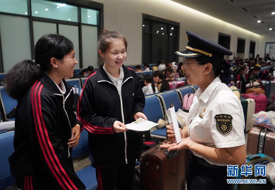 7月2日,在苏州站候车专区,苏州站工作人员在给秀州中学高一学生热伊莱(中)、阿依努尔讲解铁路安全知识。 当日,浙江省嘉兴市秀州中学的312名内地新疆高中班学生在老师陪同下,从嘉兴乘坐汽车前往苏州站,转乘Z40次列车返回家乡。中国铁路上海局集团有限公司苏州站开启绿色进站通道,开辟候车专区,确保“内高班”学生暑期顺利返疆。 新华社记者 季春鹏 摄