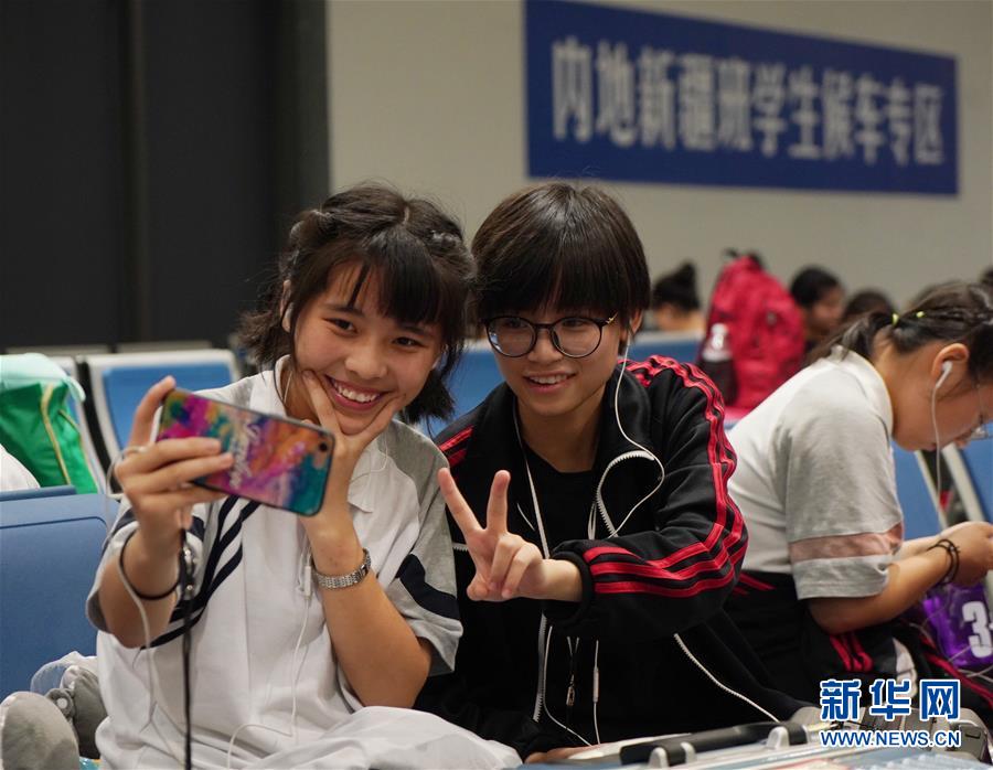 7月2日,秀州中学“内高班”学生在苏州站候车专区自拍留念。 当日,浙江省嘉兴市秀州中学的312名内地新疆高中班学生在老师陪同下,从嘉兴乘坐汽车前往苏州站,转乘Z40次列车返回家乡。中国铁路上海局集团有限公司苏州站开启绿色进站通道,开辟候车专区,确保“内高班”学生暑期顺利返疆。 新华社记者 季春鹏 摄