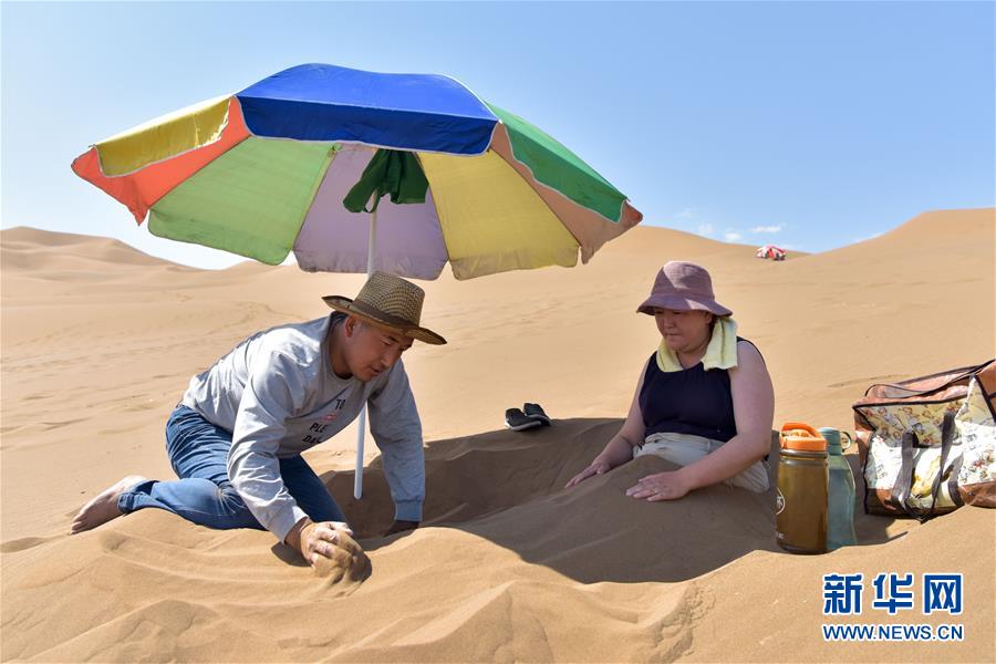 7月2日,游客在新疆鄯善县库木塔格沙漠体验沙疗。 入夏以来,素有“火洲”之称的新疆吐鲁番开启高温模式,独特的气候给沙疗保健提供了特殊的环境,不少游客不惧高温炙热,到沙漠体验沙疗,享受大汗淋漓的快感。 新华社记者 丁磊 摄