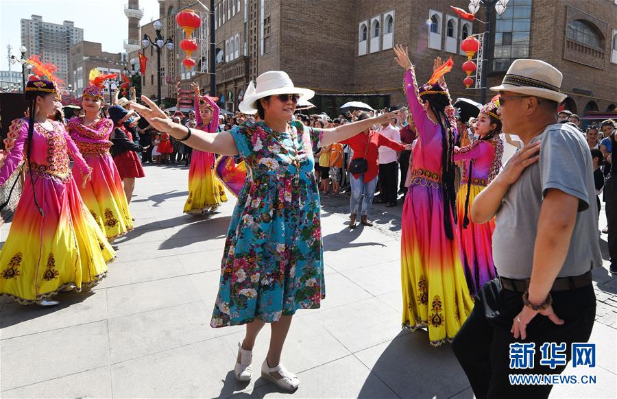 7月2日,游客和演员在大巴扎景区随音乐跳舞。 位于乌鲁木齐市的大巴扎景区是国内外游客来到新疆的必游之地。进入6月以来,大巴扎景区已迎来游客170多万人次。 新华社记者 王菲 摄