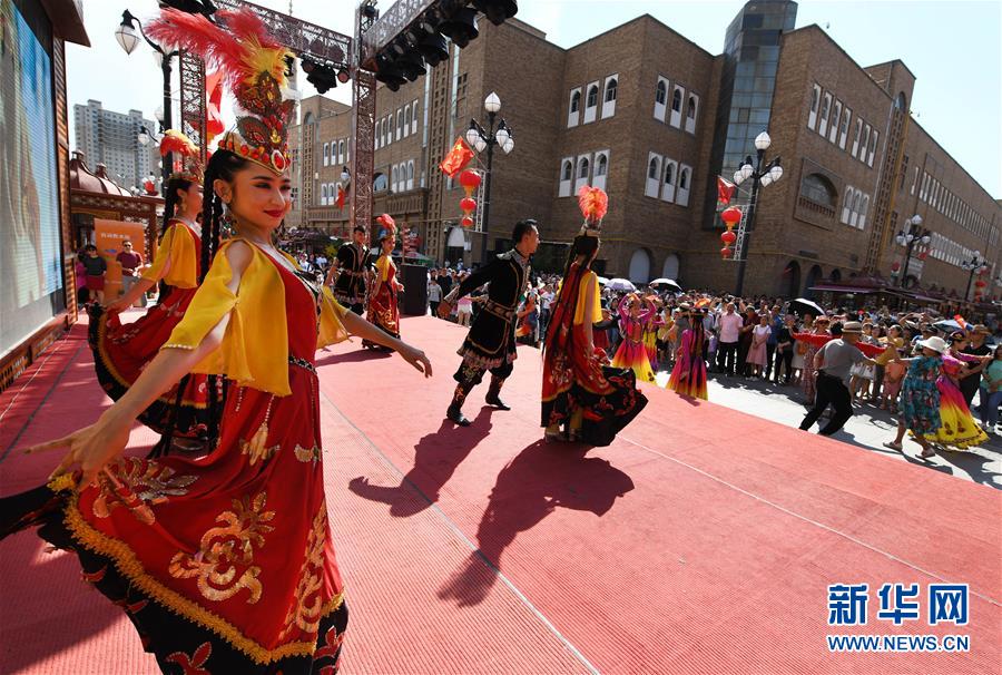 7月2日,演员和游客在大巴扎景区随音乐跳舞。 位于乌鲁木齐市的大巴扎景区是国内外游客来到新疆的必游之地。进入6月以来,大巴扎景区已迎来游客170多万人次。 新华社记者 王菲 摄