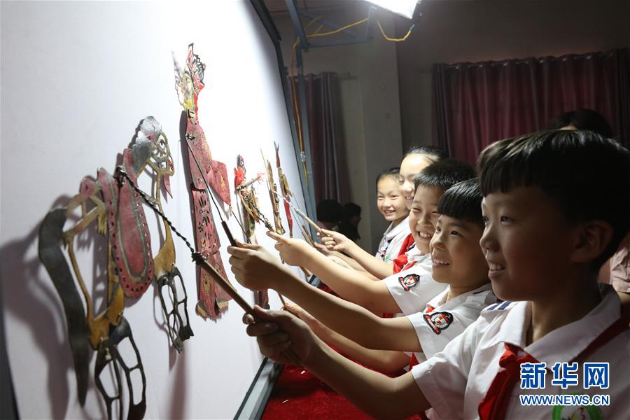 7月3日,河北省邯郸市逸夫小学的学生在体验皮影戏。 新华社发(杨扬 摄)