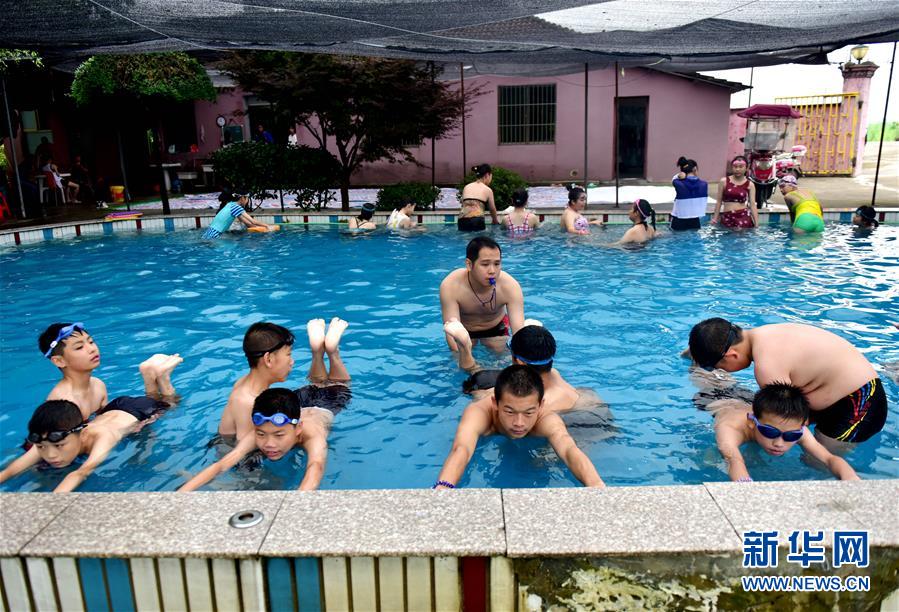 7月3日,小朋友们在浙江省武义县一游泳馆学习游泳。 新华社发(张建成 摄)