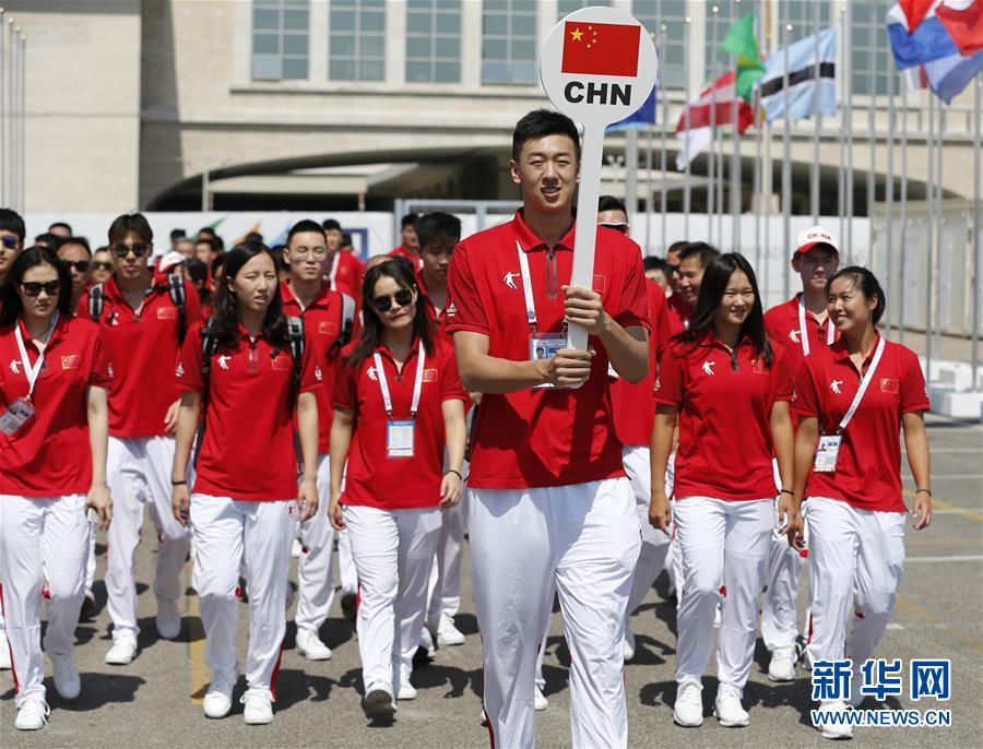 7月3日,中国大学生体育代表团成员代表步入升旗广场。 当日,参加第30届世界大学生运动会的中国大学生体育代表团部分成员在那不勒斯海港升旗广场举行升旗仪式。 新华社记者 孟永民 摄