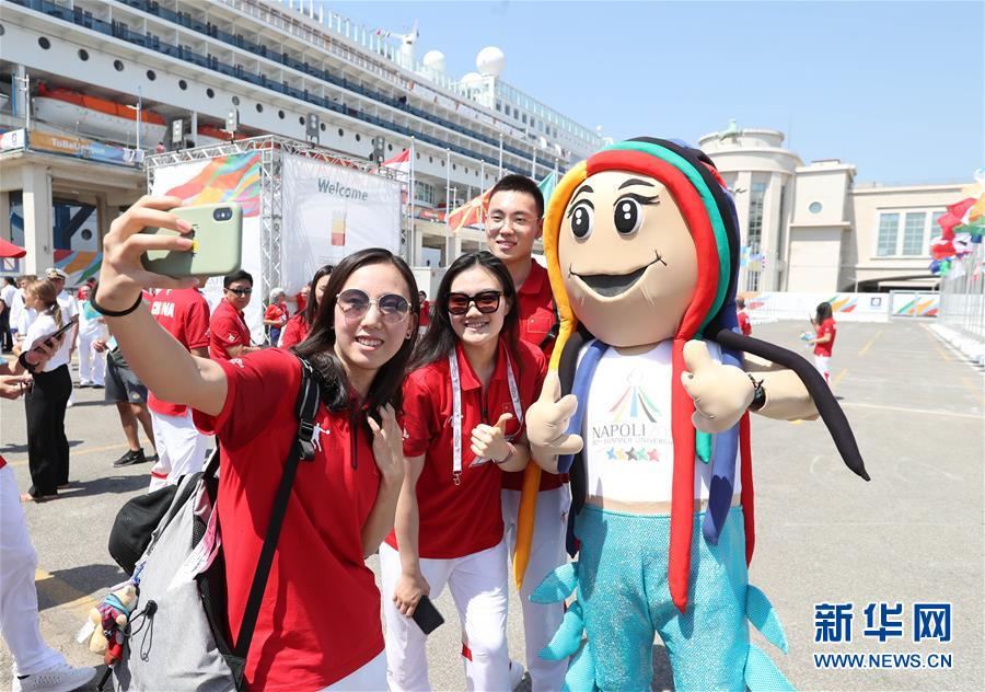 7月3日,中国大学生体育代表团成员在升旗仪式结束后与吉祥物合影。 当日,参加第30届世界大学生运动会的中国大学生体育代表团部分成员在那不勒斯海港升旗广场举行升旗仪式。 新华社记者 孟永民 摄