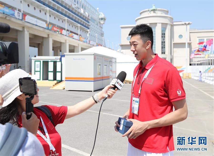 7月3日,中国大学生体育代表团开幕式旗手王少杰(右)在升旗仪式结束后接受采访。 当日,参加第30届世界大学生运动会的中国大学生体育代表团部分成员在那不勒斯海港升旗广场举行升旗仪式。 新华社记者 孟永民 摄
