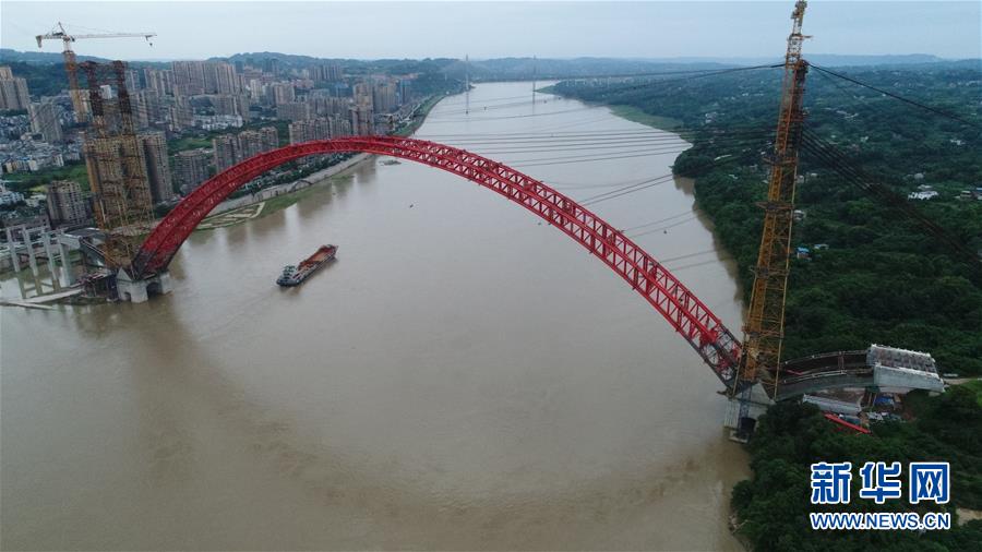 大桥主拱的最后一段拱肋吊装到位(6月29日无人机拍摄)。 7月3日上午,世界主跨跨径最大的飞燕式钢管混凝土系杆拱桥——合江长江公路大桥主拱顺利合龙,标志着大桥顺利完成施工风险最高、难度最大的关键节点工程。该桥位于四川省泸州市合江县,建成后将彻底结束长江北岸百姓摆渡过江的历史。 新华社发