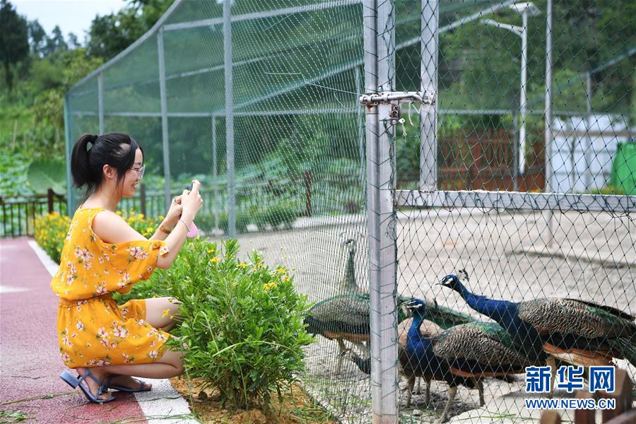 7月2日,游客在位于马灌镇双石村的凤吟孔雀园内参观。