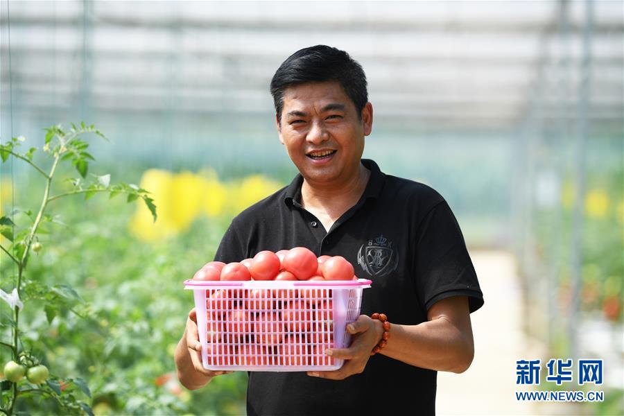7月2日,周玉高在位于马灌镇果园村的无土栽培西红柿大棚内展示刚采摘下来的西红柿。