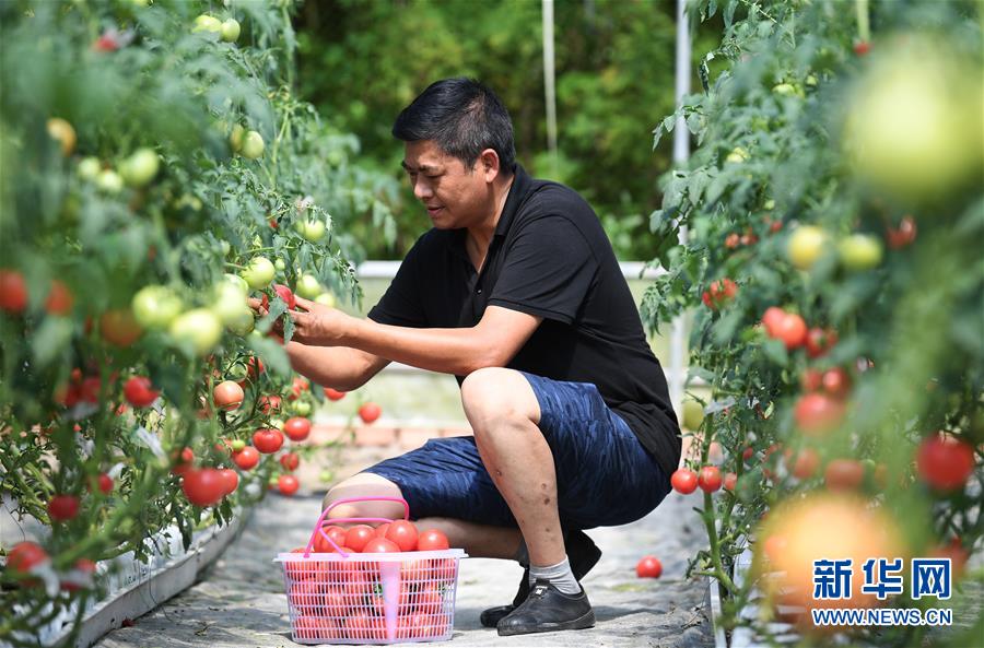 7月2日,周玉高在位于马灌镇果园村的无土栽培西红柿大棚内采摘。