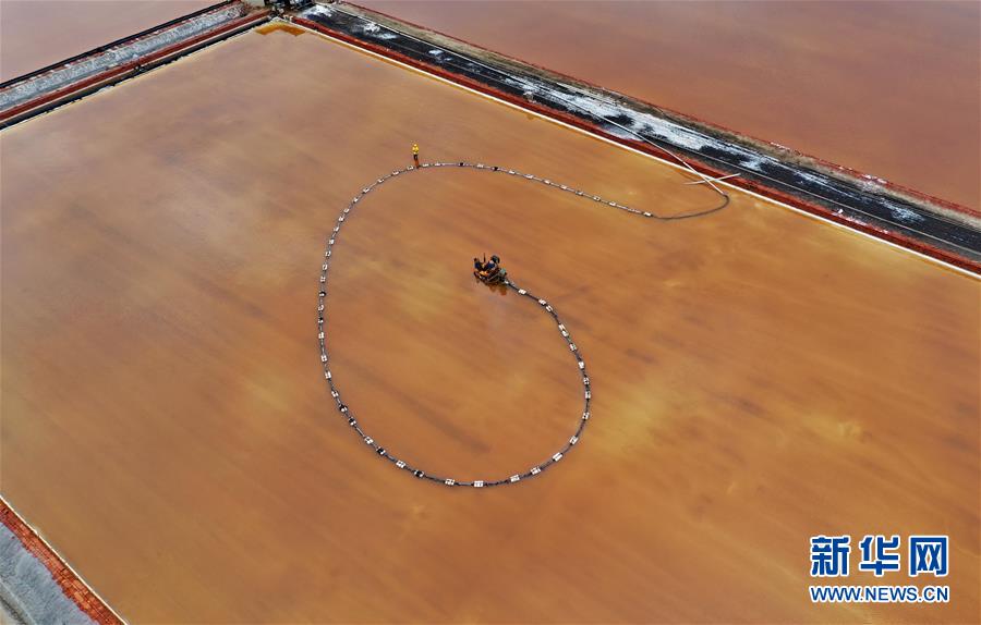 7月3日,唐山海港经济开发区大清河盐场的工人在操作机械设备收获春盐(无人机拍摄)。新华社记者 杨世尧 摄