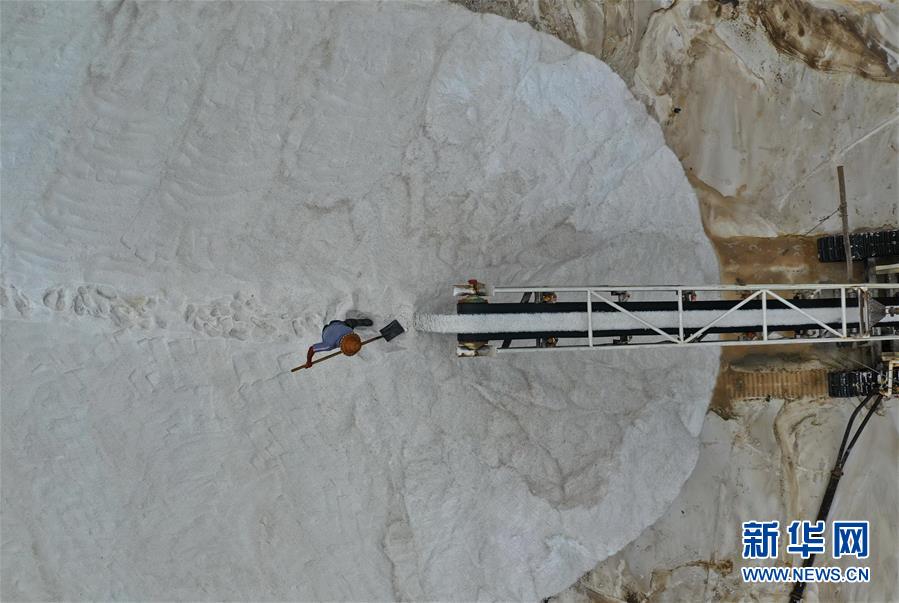 7月3日,唐山海港经济开发区大清河盐场的工人在盐堆上工作(无人机拍摄)。新华社记者 杨世尧 摄