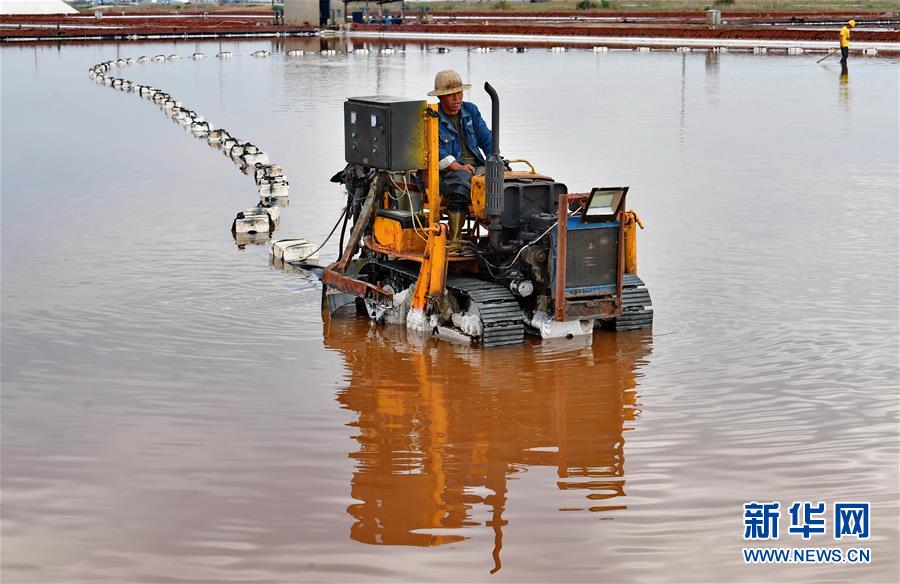 7月2日,唐山海港经济开发区大清河盐场的工人在操作机械设备收获春盐。新华社记者 杨世尧 摄