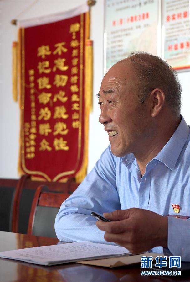 7月2日,在林州市任村镇盘龙山村,王生有跟村干部开会交流。新华社记者 李安 摄