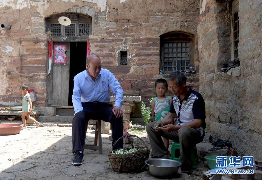 7月2日,在林州市任村镇盘龙山村,王生有到村民家中了解生活情况。新华社记者 李安 摄