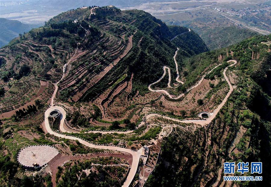 这是王生有带领村民修缮硬化的盘龙山村通往山下的道路(7月3日无人机拍摄)。新华社记者 李安 摄