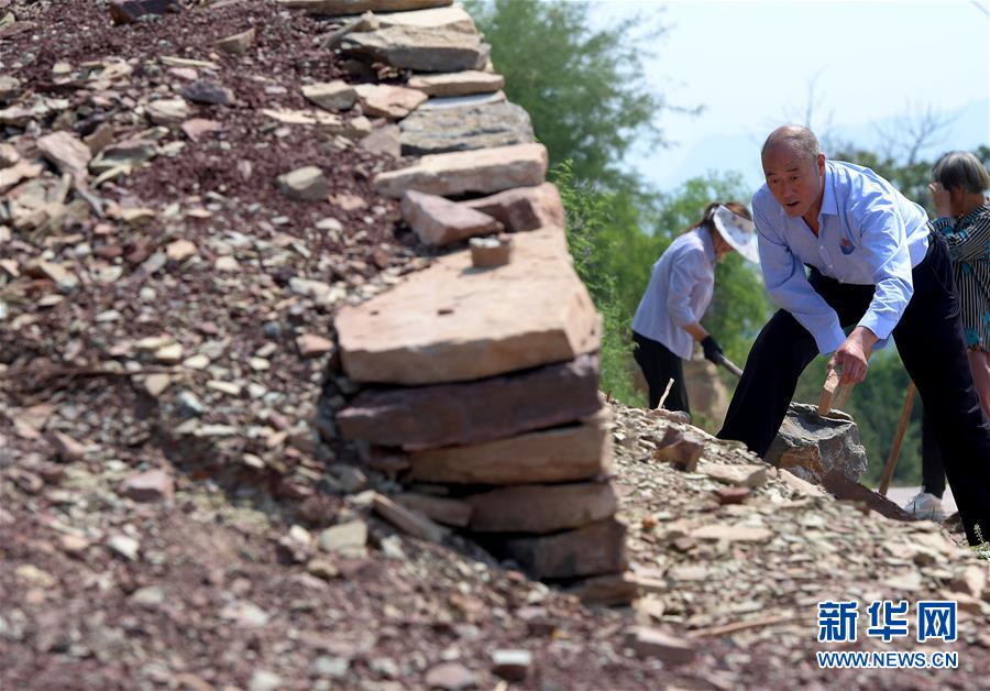 7月3日,在林州市任村镇盘龙山村,王生有(前)带领村民清理乱石维护道路。新华社记者 李安 摄