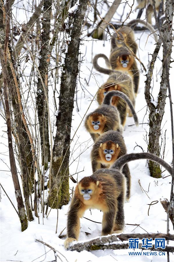 金丝猴在神农架大龙潭山林中行走(2016年1月13日摄)。 新华社记者 杜华举 摄