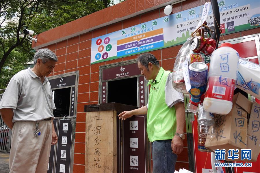 7月3日,在上海市黄浦区五里桥街道龙华社区,志愿者陈启法向居民介绍自制的干湿分离器。 新华社记者陈君清摄