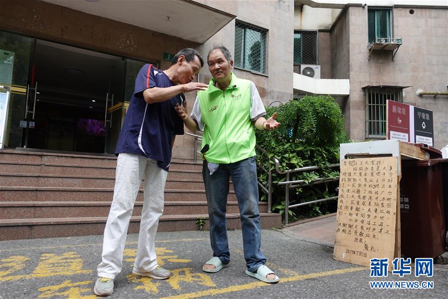 7月3日,在上海市黄浦区五里桥街道龙华社区,志愿者陈启法与社区居民交流垃圾分类的情况。垃圾桶旁摆放着老陈自制的垃圾分类告示。 新华社记者陈君清摄