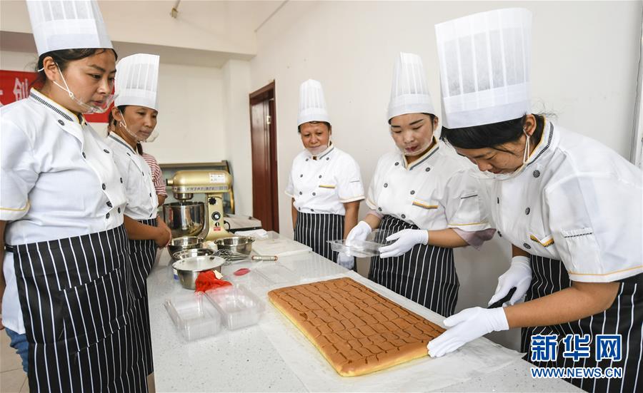 7月4日,河北省衡水市武邑县一所家政培训机构,老师(右一)在指导学员学习面点制作。 近年来,河北省衡水市武邑县不断加大就业技能培训力度,依托家政培训机构和培训基地,免费为贫困农民提供面点、家政等技能培训,让百姓不出远门也能就业。 新华社记者 李晓果 摄