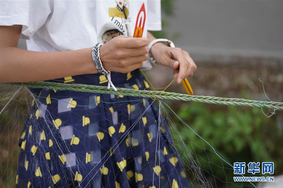 7月4日,河北黄骅市南排河镇后范家堡村的孩子在帮助大人织渔网。 时下正值黄渤海休渔期,河北省黄骅市的渔民在盛夏时节忙着织网,确保开渔后顺利生产。 新华社记者 邢广利 摄