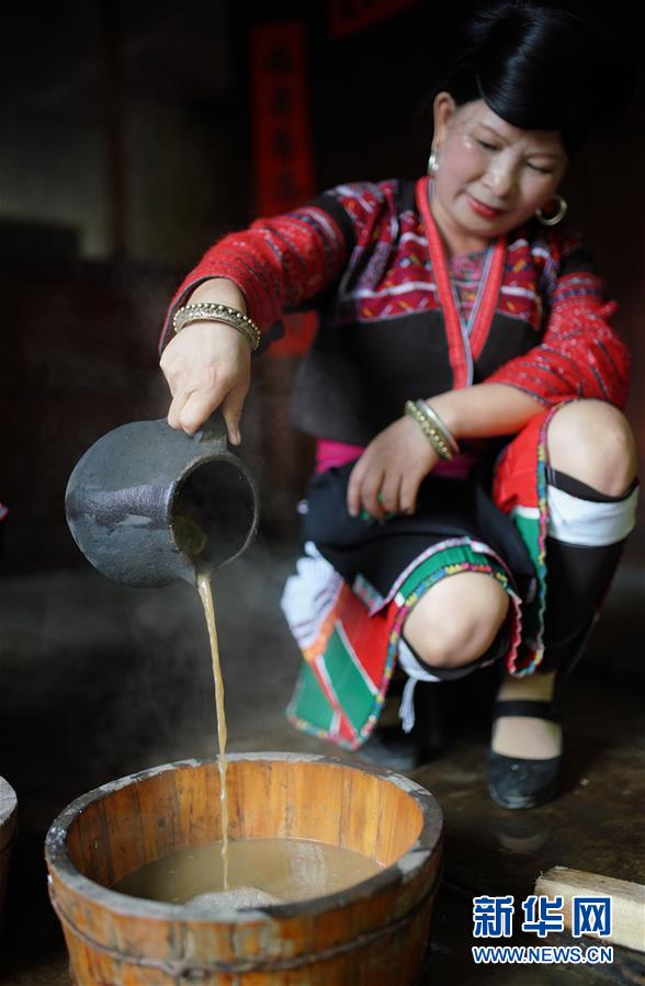 7月4日,在广西龙胜各族自治县龙脊镇黄洛瑶寨,一名红瑶妇女将发酵好的淘米水倒入木盆里。 在广西龙胜各族自治县龙脊镇黄洛瑶寨,红瑶女性有世代相传的蓄发和梳妆发型习俗,以及护发“秘方”。她们将橙子皮、茶油渣和一些中草药放进淘米水中煮开发酵,待冷却后用来洗头。经过这种特殊护发方法护理的长发柔顺、黑亮,是瑶寨一道靓丽的风景。2012年,“龙胜瑶族长发习俗”被列入广西壮族自治区非物质文化遗产名录。 新华社发(黄勇丹 摄)