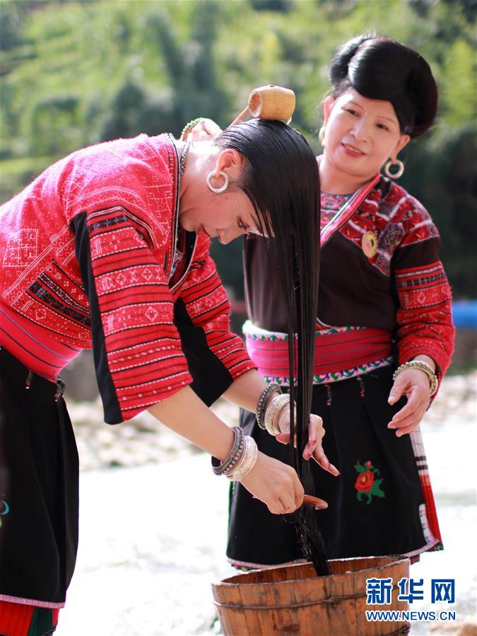 7月4日,在广西龙胜各族自治县龙脊镇黄洛瑶寨,红瑶妇女用特制的淘米水洗长发。 在广西龙胜各族自治县龙脊镇黄洛瑶寨,红瑶女性有世代相传的蓄发和梳妆发型习俗,以及护发“秘方”。她们将橙子皮、茶油渣和一些中草药放进淘米水中煮开发酵,待冷却后用来洗头。经过这种特殊护发方法护理的长发柔顺、黑亮,是瑶寨一道靓丽的风景。2012年,“龙胜瑶族长发习俗”被列入广西壮族自治区非物质文化遗产名录。 新华社发(刘教清 摄)
