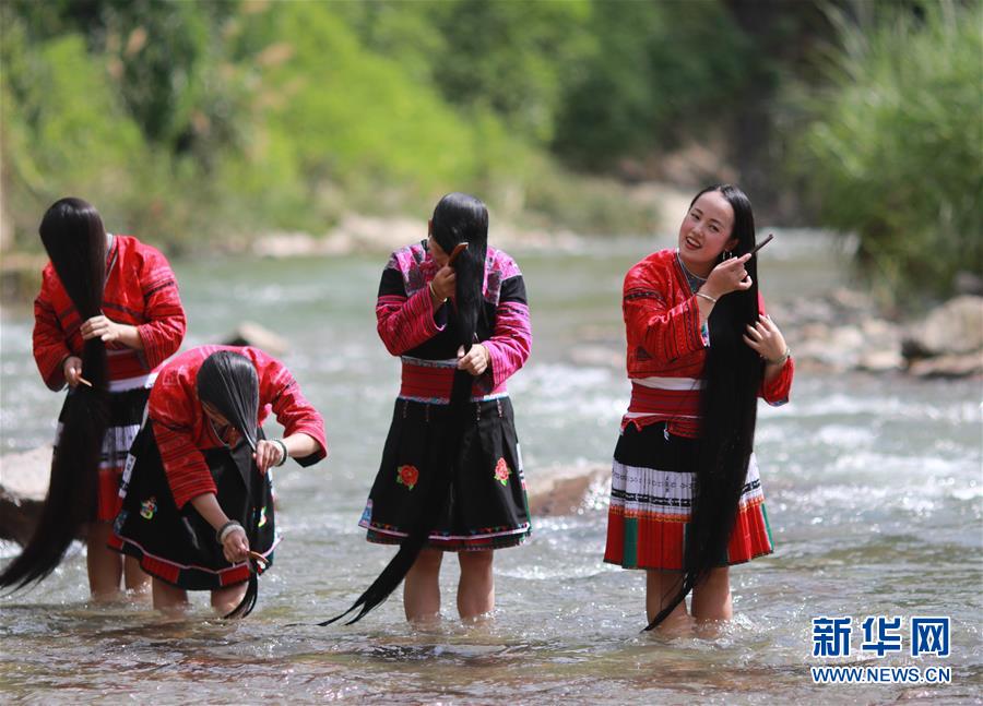 7月4日,在广西龙胜各族自治县龙脊镇黄洛瑶寨,红瑶妇女在河中洗长发。 在广西龙胜各族自治县龙脊镇黄洛瑶寨,红瑶女性有世代相传的蓄发和梳妆发型习俗,以及护发“秘方”。她们将橙子皮、茶油渣和一些中草药放进淘米水中煮开发酵,待冷却后用来洗头。经过这种特殊护发方法护理的长发柔顺、黑亮,是瑶寨一道靓丽的风景。2012年,“龙胜瑶族长发习俗”被列入广西壮族自治区非物质文化遗产名录。 新华社发(刘教清 摄)