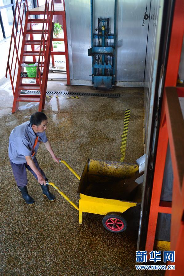 7月4日,乾元生态资源化处理中心的工作人员在收集有机肥料,这些有机肥料是易腐烂垃圾经过微生物发酵而成的。 2019年以来,浙江省德清县乾元镇坚持垃圾全程分类,完善生活垃圾分类投放、分类收集、分类运输、分类处置的全链条管理制度。乾元镇农村的易腐垃圾收集率稳步上升,高效实现垃圾减量化。 新华社记者 尹栋逊 摄