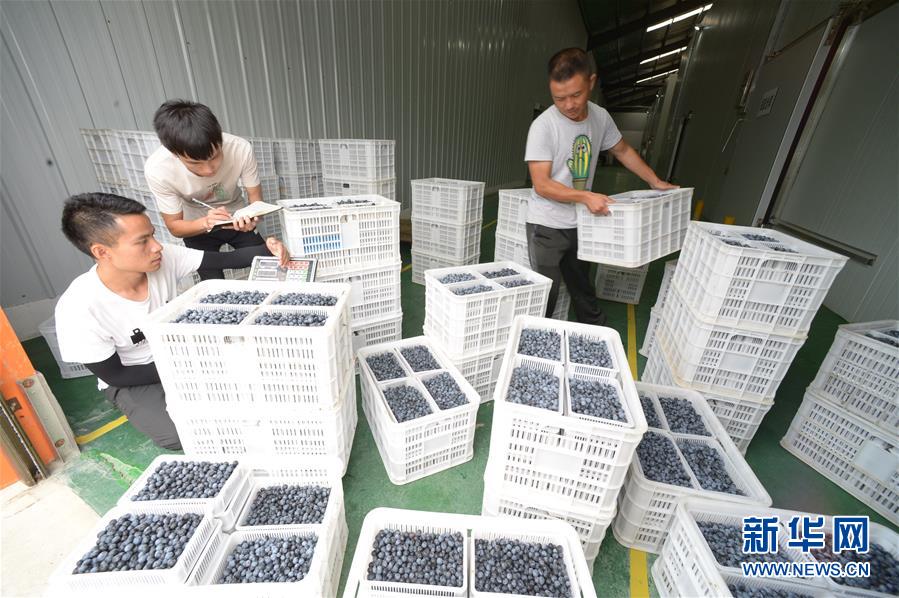 7月4日,在贵州省黔东南苗族侗族自治州麻江县生态蓝莓产业示范园,工人在入库收购的蓝莓。