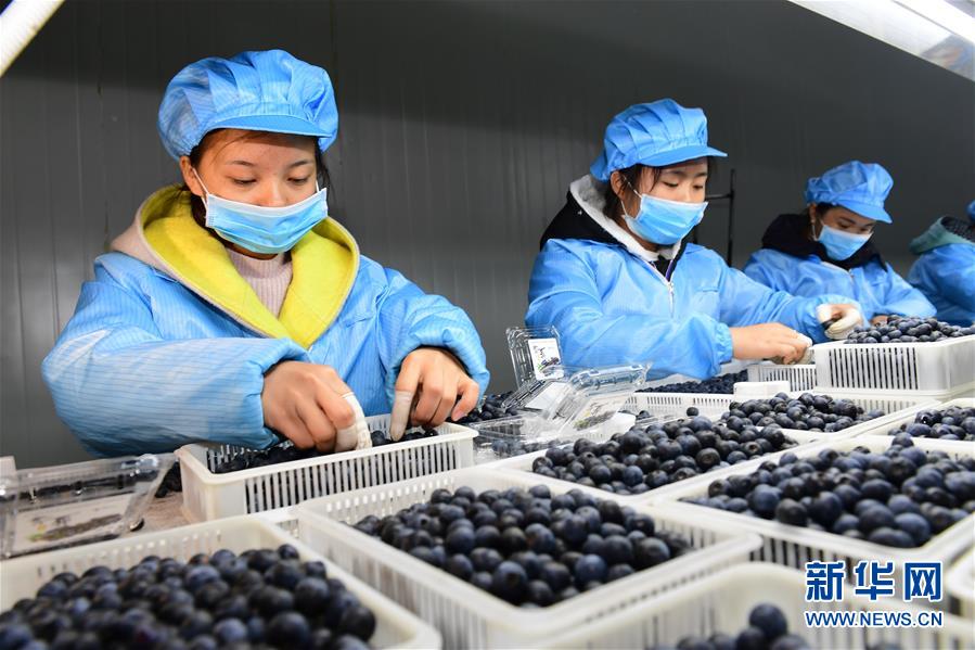 7月4日,在贵州省黔东南苗族侗族自治州麻江县生态蓝莓产业示范园,工人在低温保鲜车间分拣蓝莓。