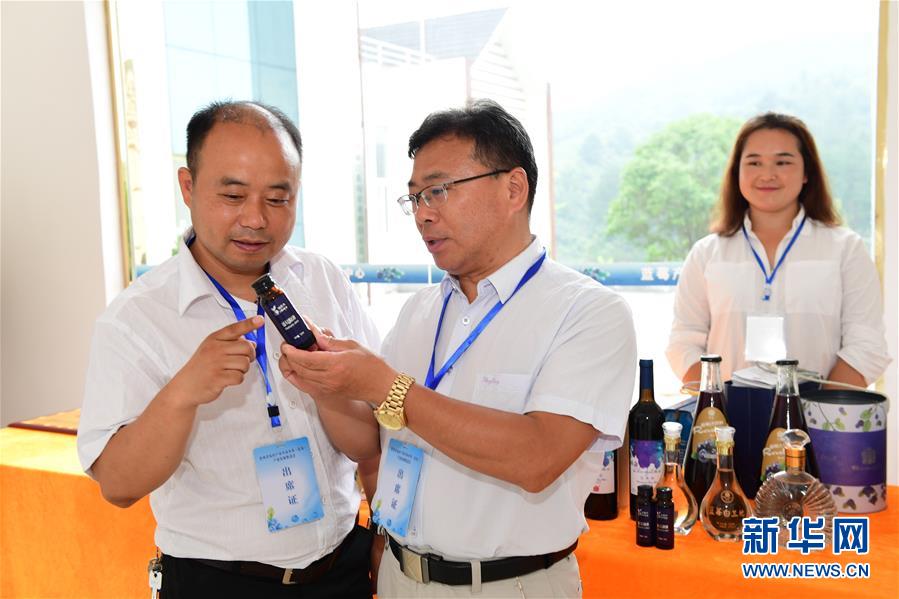 7月4日,在贵州省黔东南苗族侗族自治州麻江县生态蓝莓产业示范园,贵州省科学院生物研究所的蓝莓专家(中)在向参加全省蓝莓产业推进会的代表介绍蓝莓深加工产品。