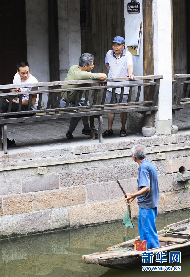 河中岸上,老邻居相谈甚欢(7月2日摄)。 新市古镇位于杭嘉湖平原腹地,德清、桐乡、余杭、湖州市区交界处,京杭大运河畔,是江南水乡古镇群中风貌保存较为完整、风俗民情富有特色的一个典型代表,是浙江省德清县的经济、文化重镇。新市古镇因水而生,因水而发展。在以舟楫为重要交通工具的时代,四乡物资集散于此,使得这里人丁兴旺、商贾四集,形成繁荣街市。一条与京杭大运河直接相通的市河环镇而流,其中1500余米市河河段上古老的明清河埠头、驳岸保存完好,花样繁多的拴缆石堪称江南一绝。 镇区内明清建筑鳞次栉比,街巷逶迤,家家临水,户户通舟。形成江南水乡古镇独特的“小桥、流水、人家”的“水乡泽国”的自然景观和“店宅合一”的商贸特征。新市保存风味独特的老宅有数十处,街道与街道之中有弄堂贯穿,弄内宅第优美典雅,古色古香,每条巷弄都有一个古老的故事,电影《林家铺子》《蚕花姑娘》中都留下了新市古弄和古桥的画面,一派水乡的原汁风味。 新华社记者 兰红光 摄