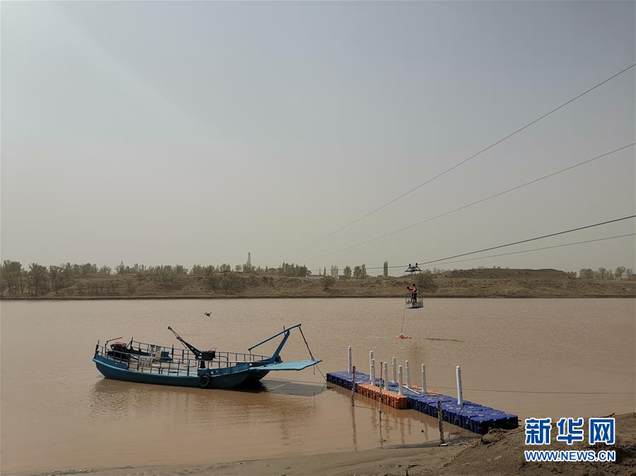 工作人员在黄河头道拐水文站进行测量作业 (4月20日手机拍摄)。 新华社记者 魏婧宇摄