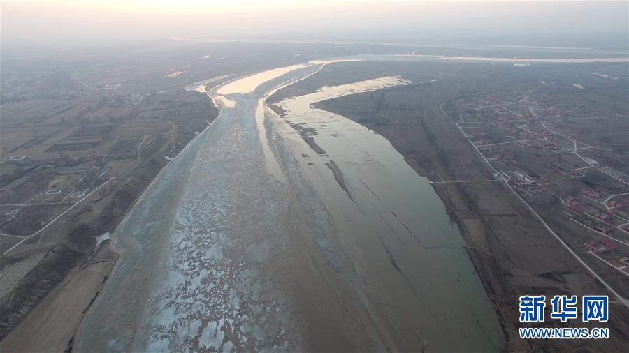 这是3月17日无人机拍摄的黄河头道拐上游断面流凌(视频截图)。 新华社记者 张晟 摄