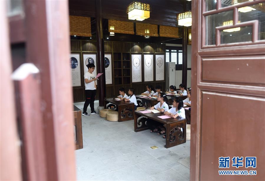 7月4日,孩子们在德清县乾元国学图书馆举办的国学公益夏令营中学唐诗。 乾元镇是浙江德清县的古县城所在地,至今已有1300多年的历史。近年来,乾元镇在美丽城镇建设过程中充分发挥现有文史馆、图书馆、非遗馆等在文化传承方面的作用,丰富当地群众精神文化生活的同时,也让这个千年江南古镇焕发出勃勃生机。 新华社记者 郭绪雷 摄