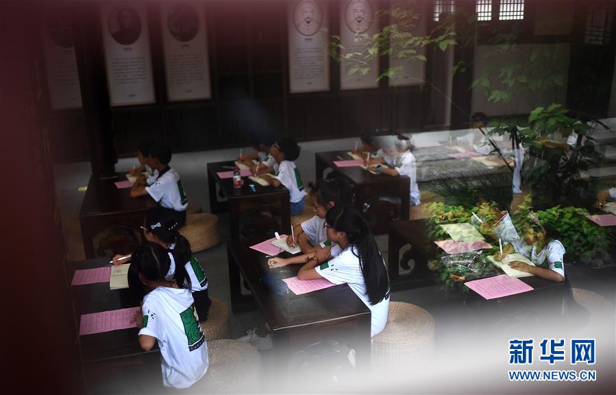 7月4日,孩子们在德清县乾元国学图书馆举办的国学公益夏令营中学唐诗。 乾元镇是浙江德清县的古县城所在地,至今已有1300多年的历史。近年来,乾元镇在美丽城镇建设过程中充分发挥现有文史馆、图书馆、非遗馆等在文化传承方面的作用,丰富当地群众精神文化生活的同时,也让这个千年江南古镇焕发出勃勃生机。 新华社记者 张宏祥 摄