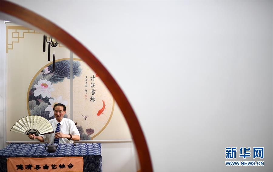 7月4日,德清县乾元镇传统民间曲艺三跳传承人闻永泉在表演中。 乾元镇是浙江德清县的古县城所在地,至今已有1300多年的历史。近年来,乾元镇在美丽城镇建设过程中充分发挥现有文史馆、图书馆、非遗馆等在文化传承方面的作用,丰富当地群众精神文化生活的同时,也让这个千年江南古镇焕发出勃勃生机。 新华社记者 张宏祥 摄