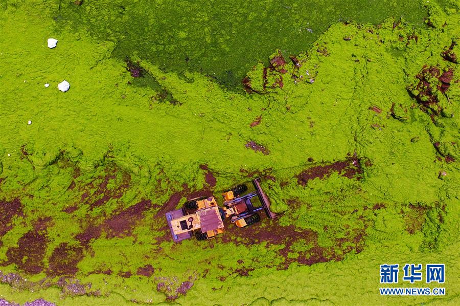7月5日,在山东青岛薛家岛,保洁人员驾驶挖掘机清理浒苔(无人机拍摄)。 进入7月,随着海水温度逐渐升高,山东青岛海岸线的浒苔呈爆发性增长,给当地的环境带来影响。环卫部门出动挖掘机和保洁人员进行清理作业,维护海岸清洁。 新华社发(王海滨 摄)
