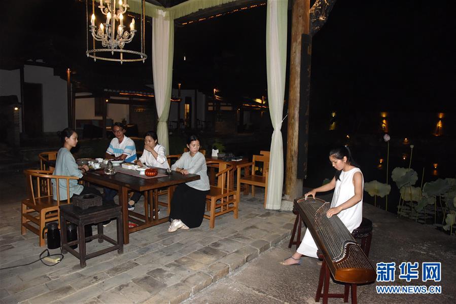 客人在婺源县塘村一家民宿的荷花池心亭内弹奏古筝(6月27日摄)。 新华社记者 张瑞琪 摄
